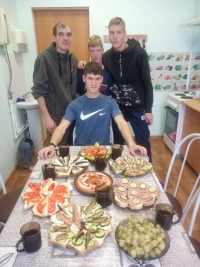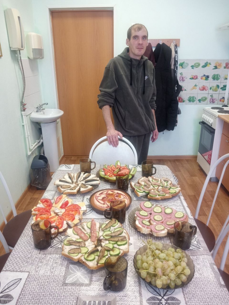 Компания собралась за столом, где приготовили простые, но вкусные угощения: свежие бутерброды и разнообразные нарезки. Такое домашнее меню создало непринуждённую обстановку, которая позволила всем чувствовать себя комфортно и расслабленно.