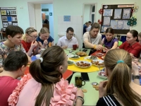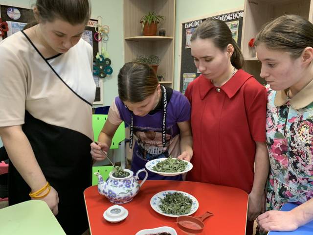 На повестке дня в первой группе-«Травяной чай» (Проект «Воскресное кафе «Вкусно и быстро»). Хозяева и гости познакомились с историей травяных напитков, традициями заваривания на Руси, ролью трав в народной медицине. Летом девушки сами собирали листья целебных растений, соблюдали технологию высушивания, хранения. Сейчас как никогда травяные чаи необходимы, т. к. простудный вирус активизировался. Участвуя в мини- викторине «Узнай траву по запаху», присутствующие распределили целебные листья по емкостям. Командами составляли рассказы о свойствах мяты, мелиссы(лимонника), малины. А затем «Создавали свой чай», самостоятельно собирая чайные смеси. Ни одно мероприятие не обходится без закрепительного этапа. Ребята организованно собирали «чайные» пазлы. Несмотря на равное распределение вопросов «Травяной викторины», горячо и дружно обсуждали, приходили к единому мнению. Вывод напросился один: необходимо расширять список заготавливаемых растений. Наверно, увлекательным заданием оказались «Чайные частушки». Репетировали активно и быстро. А ведь получилось и понравилось! Самая приятная часть встречи-«Чайная церемония». Как же вкусно пить целебный напиток зимним вечером, да еще вприкуску с баранками, вареньем из смородины и сухофруктами и при этом делиться своими вкусовыми ощущениями!