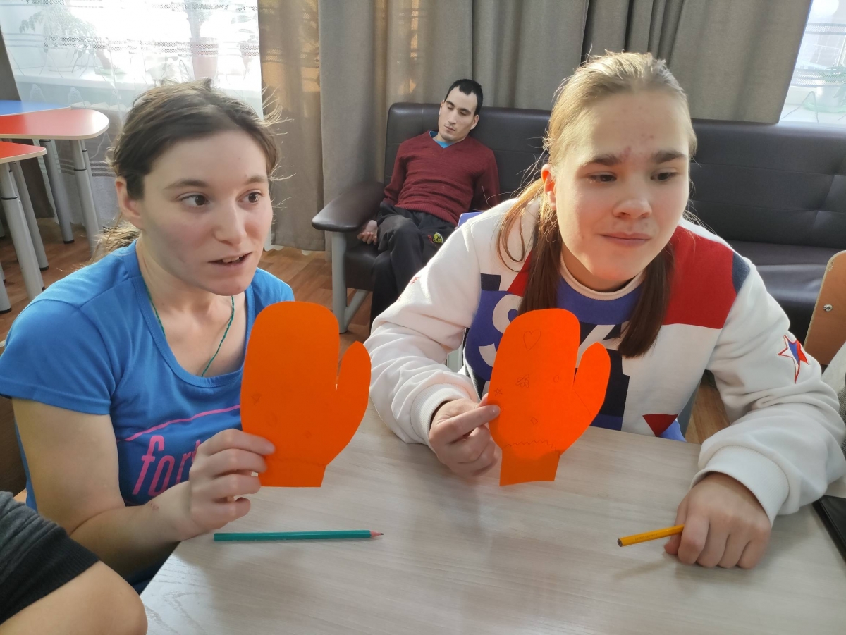 Каждый участник получил бумажную «варежку» одного из ярких цветов. Задача — найти пару с такой же варежкой и вместе придумать, как украсить её орнаментом. При этом орнамент на обеих варежках должен быть одинаковым.