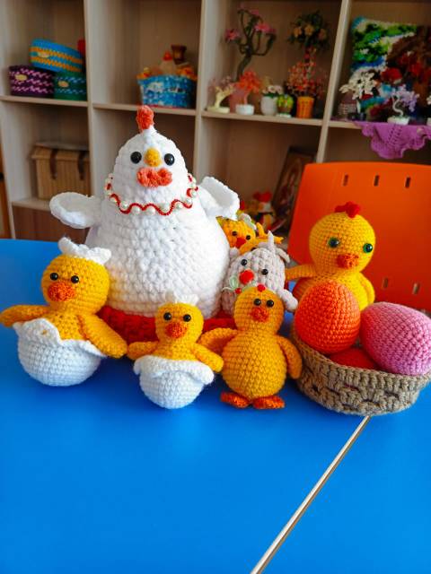 Наша воспитанница Любовь Соколова продолжает удивлять и радовать нас своими невероятными работами, созданными с помощью крючка. На этот раз она порадовала всех замечательной пасхальной композицией – очаровательной курочкой и ее пушистыми цыплятами!