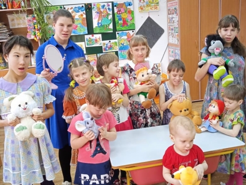А мы любим в сказки играть! В игре «Из какой мы сказки?» девочкам были показаны небольшие фрагменты, из которых им нужно было узнать героев и определить, из какой они сказки. Также им надо было узнать сказку по иллюстрациям и называть ее героев. Помимо этого девочки отгадывали загадки и обыгрывали отрывки из отгаданной сказки с зеркалом, с волшебным яблоком и с золотым яйцом.