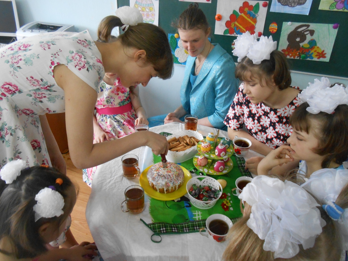 В воскресенье 7 апреля в группе «Солнышко» прошло мероприятие, посвященное светлому празднику Пасхи. В начале,воспитатель группы Кураева Марина Алексеевна рассказала детям о традициях праздника. Затем организовала интересные игры, девочки украшали яйца наклейками, катали их, переносили в ложках и разбивали. Закончилось мероприятие разрезанием пасхального кулича и чаепитием.