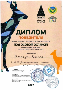 Наконец-то подведены итоги муниципального экологического конкурса рисунков «Под особой охраной» который проводился с 01 февраля по 1 июня 2022 года. Цель конкурса стало привлечение внимания жителей Большемуртинского района к вопросам охраны окружающей среды и функционирования заказника. Организаторами конкурса являлись КГКУ «Дирекция по ООПТ», МБУ ДО «Большемуртинский ДТ», АО «Свинокомплекс «Красноярский». Конкурс содержал 4 возрастные группы участников, для каждой из которых была определена своя тема. В конкурсе приняли участие 17 образовательных организаций. Всего на конкурс поступило 167 работ. Наш воспитанник Кирилл Б. заслужено получил суперприз от компании СИБАГРО. Награждение проводилось1 июня 2022 года на районном празднике "Карамельная страна", который прошел в Большемуртинском ДК. Кирилл не смог присутствовать на вручении в виду того, что он находился на творческом фестивале в г. Санкт-Петербурге. Диплом и призы были переданы ему чуть позже.