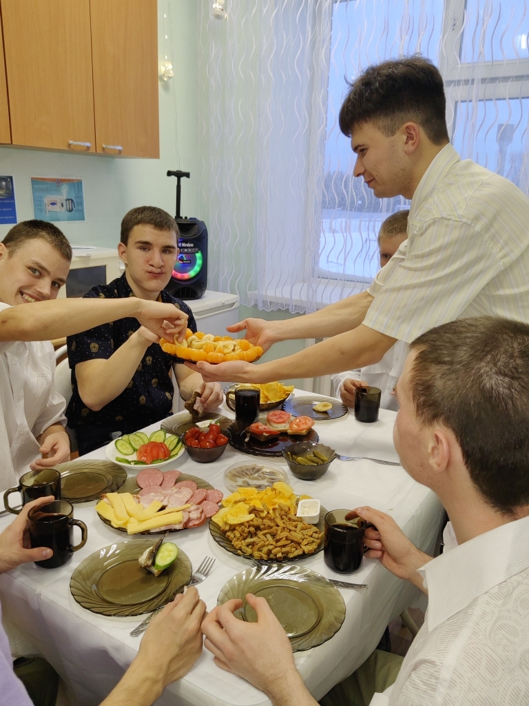 Руслан с теплотой и заботой подготовил всё к встрече: нарезал бутерброды, приготовил аппетитные нарезки и с особым вниманием украсил праздничный стол. В уютной, наполненной добротой атмосфере друзья собрались вместе — смеялись, вспоминали яркие моменты из прошлого: совместные прогулки, поездки, моменты, объединившие их сердца.