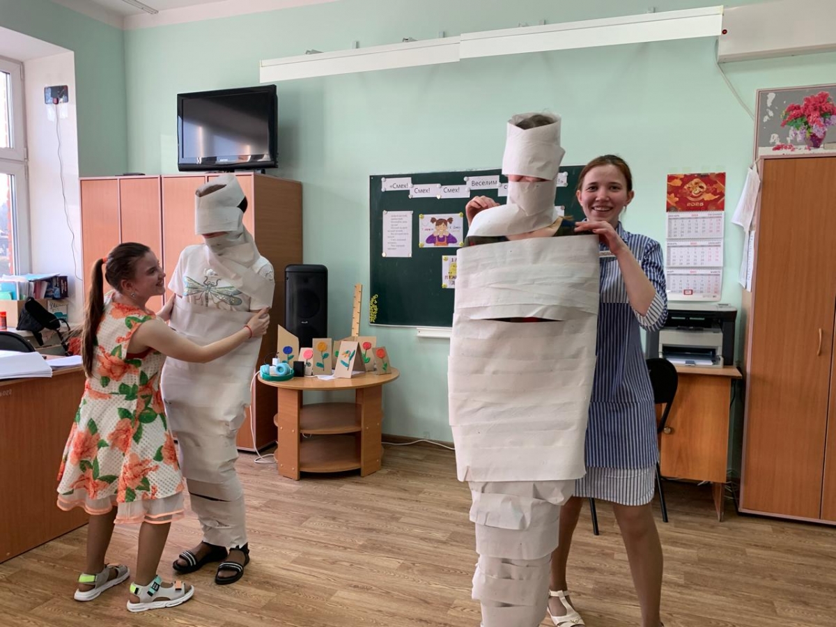 А далее- командные конкурсы и задания. «Апельсинки» и «Веснушки» поприветствовали друг друга, и … турниры начались. Тесты «Продолжи пословицу», «Шутка- загадка», «Воздушный бой» требовали от участников сообразительности, внимания, а задание «Попади в бутылку» точности и двигательной активности. От «Мумии» все были в восторге, каждому захотелось побывать в роли персонажа одноименного фильма. Завораживающее зрелище!