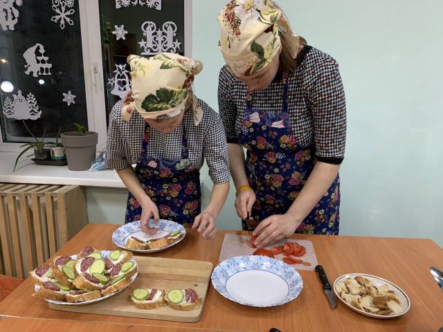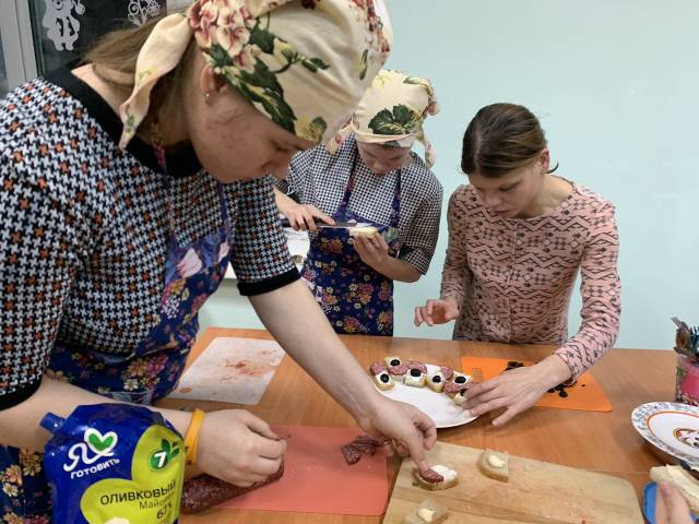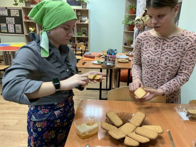 Девчонок первой группы не пришлось уговаривать «приготовить стол». Разнообразные закусочные бутерброды появились быстро: работали уверенно и с вдохновением. В целях профилактики респираторных заболеваний- десерт с медом на сотах. Вкусно и полезно, да еще с горячим зеленым чаем! Всем здоровья!