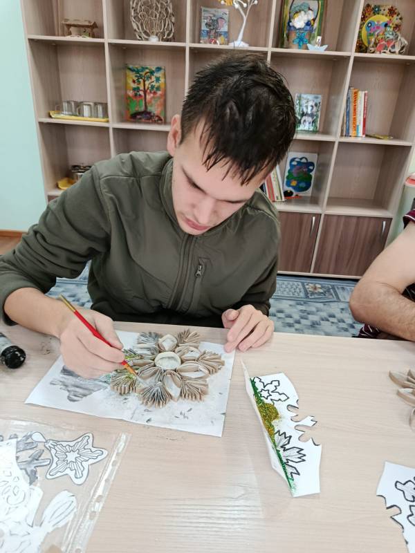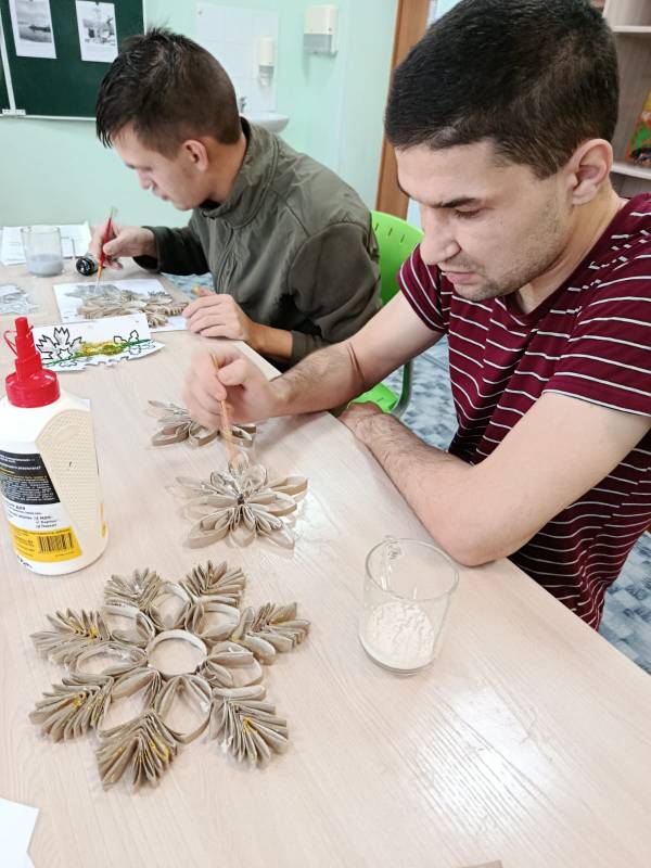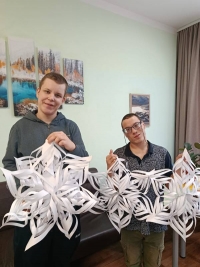 В атмосфере предвкушения праздника и творческого вдохновения в КГБУ СО «Реабилитационный центр для лиц, страдающих психическими расстройствами, «Родничок» прошёл увлекательный мастер-класс по созданию объёмных новогодних снежинок.