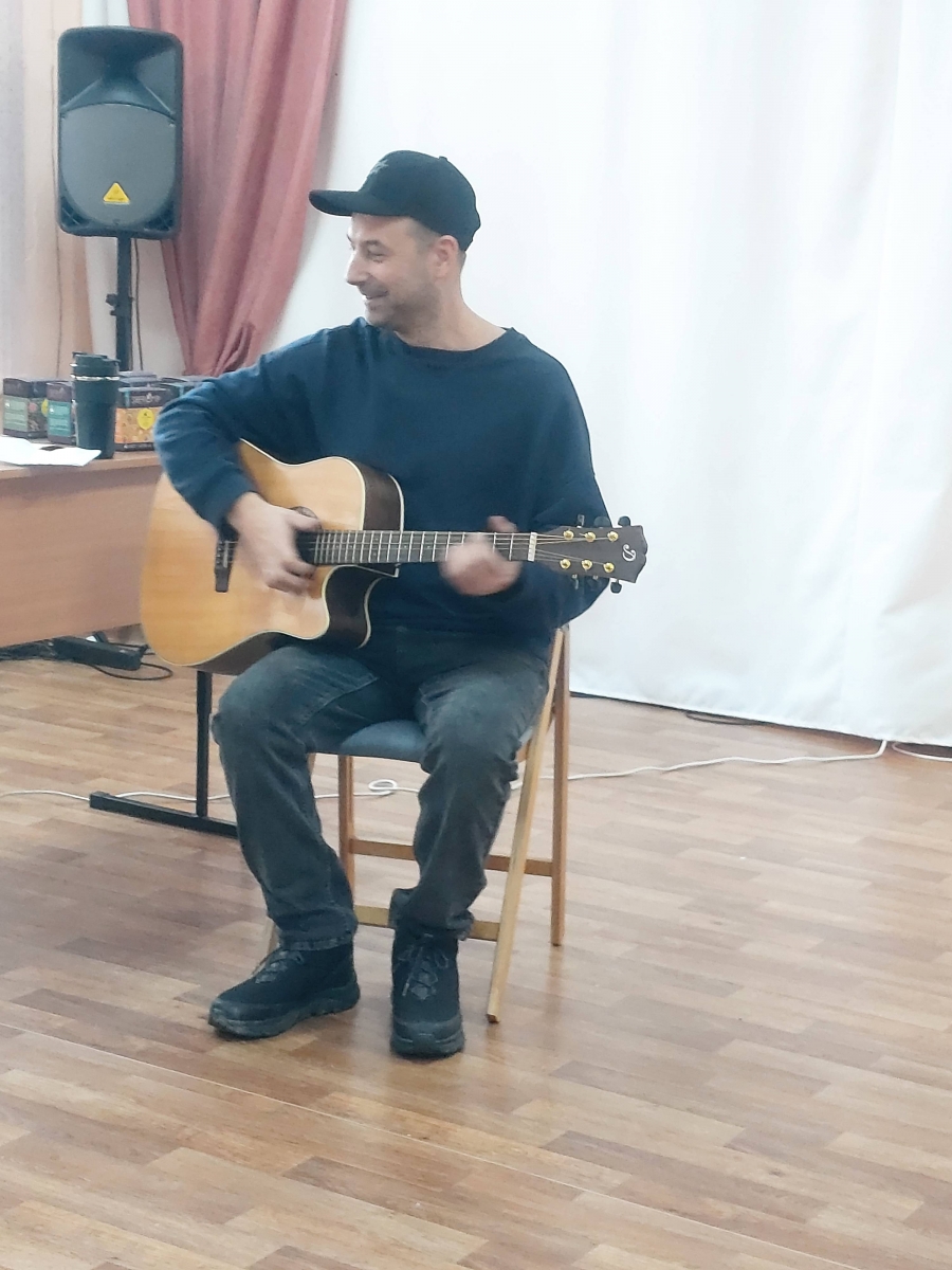 Второй гость, Андрей Куприянов, подарил центру настоящий живой концерт. Музыкант, чьи песни знают и любят далеко за пределами Красноярского края, исполнил для ребят свои авторские композиции. Но самым трогательным моментом стало то, что после сольного выступления Андрей взял гитару и запел вместе с проживающими — песни полились уже хором, объединяя всех в едином творческом порыве.