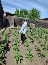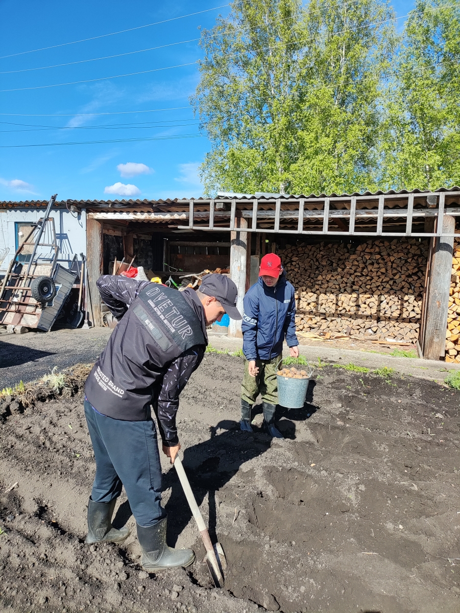 Воспитанники нашего интерната также решили внести свой посильный вклад и с удовольствием согласились оказать помощь маме нашего земляка, участника СВО. Ребята со знанием дела дружно взялись за работу: подняли из подвала овощи, семенным картофелем засадили приусадебный участок Татьяны Алексеевны, поборолись с сорняками и размели дорожки.